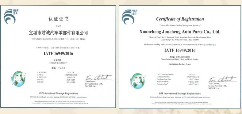 宣城市君誠汽車零部件有限公司是專業生產各類汽車鉸鏈及限位器的民營企業,總投資3000余萬元,位于宣城高新技術產業開發區,緊鄰宣廣、宣蕪高速公路,地理位置優越,交通便捷。是“國家高新技術企業、知識產權貫標企業、安徽省商標示范企業、安徽省科技型企業”,已獲得國家發明專利18項,實用新型發明專利4項。主要從事各類汽車門鉸鏈及限位器的設計、研發、生產、和銷售,具有專業的合作團隊。自2015年正式生產至今,已形成一整套完整的生產、質量管理體系。并已通過國家強制性產品認證“3C”體系認證及IATF16949國際質量體系認證。 在生產設備上,公司擁... 【查看詳細】